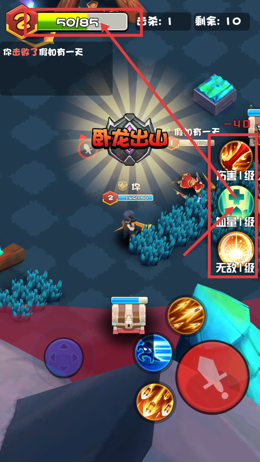 3、升级后选择【血量1级】等技能,提升生存与战力,推进【50/85】经验条进度。