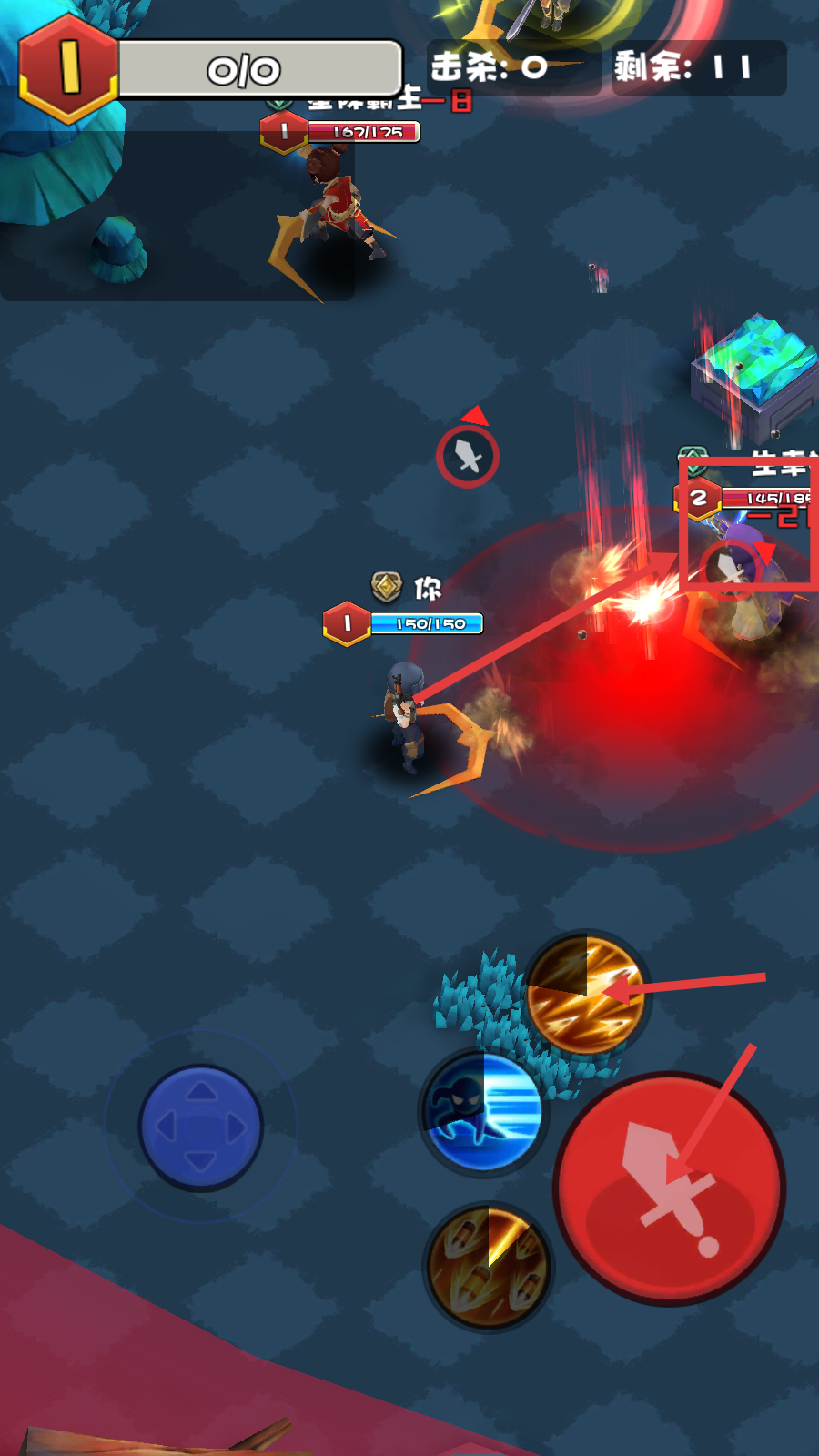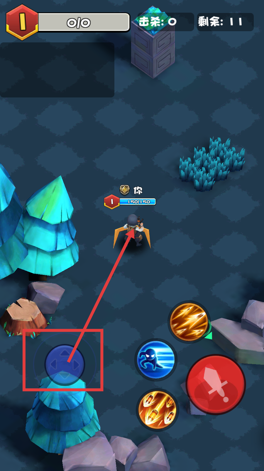 1、利用蓝色方向键移动角色,关注【击杀:0】和【剩余:11】信息,熟悉操作后开启战斗。