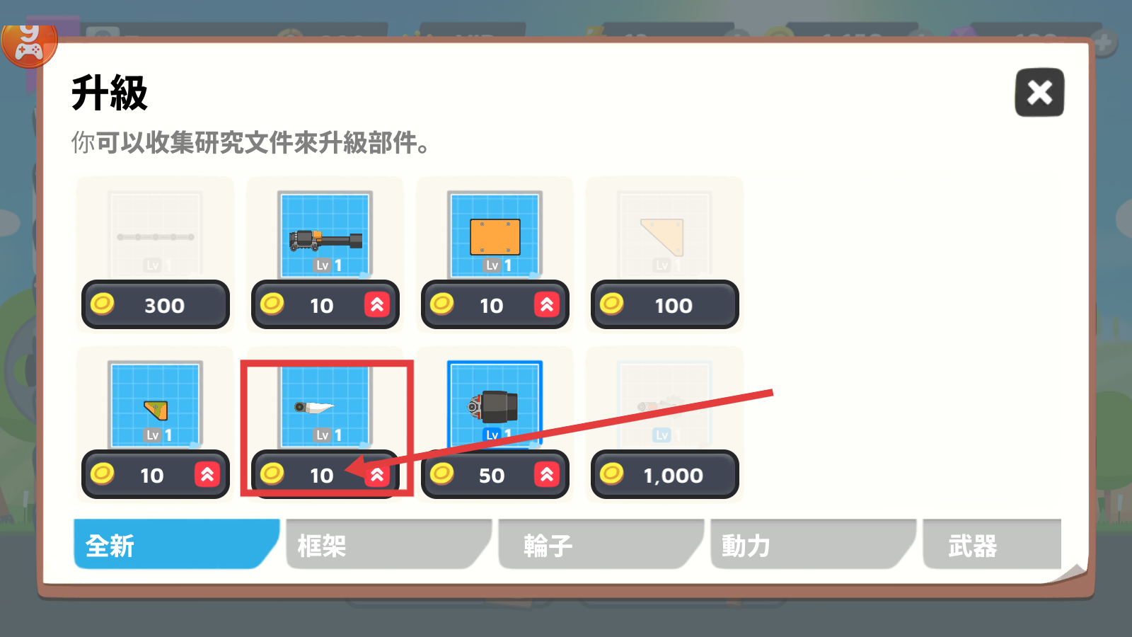 1、在升级界面消耗10金币升级【尖刺-Lv1】等部件,收集研究文件提升坦克战力。