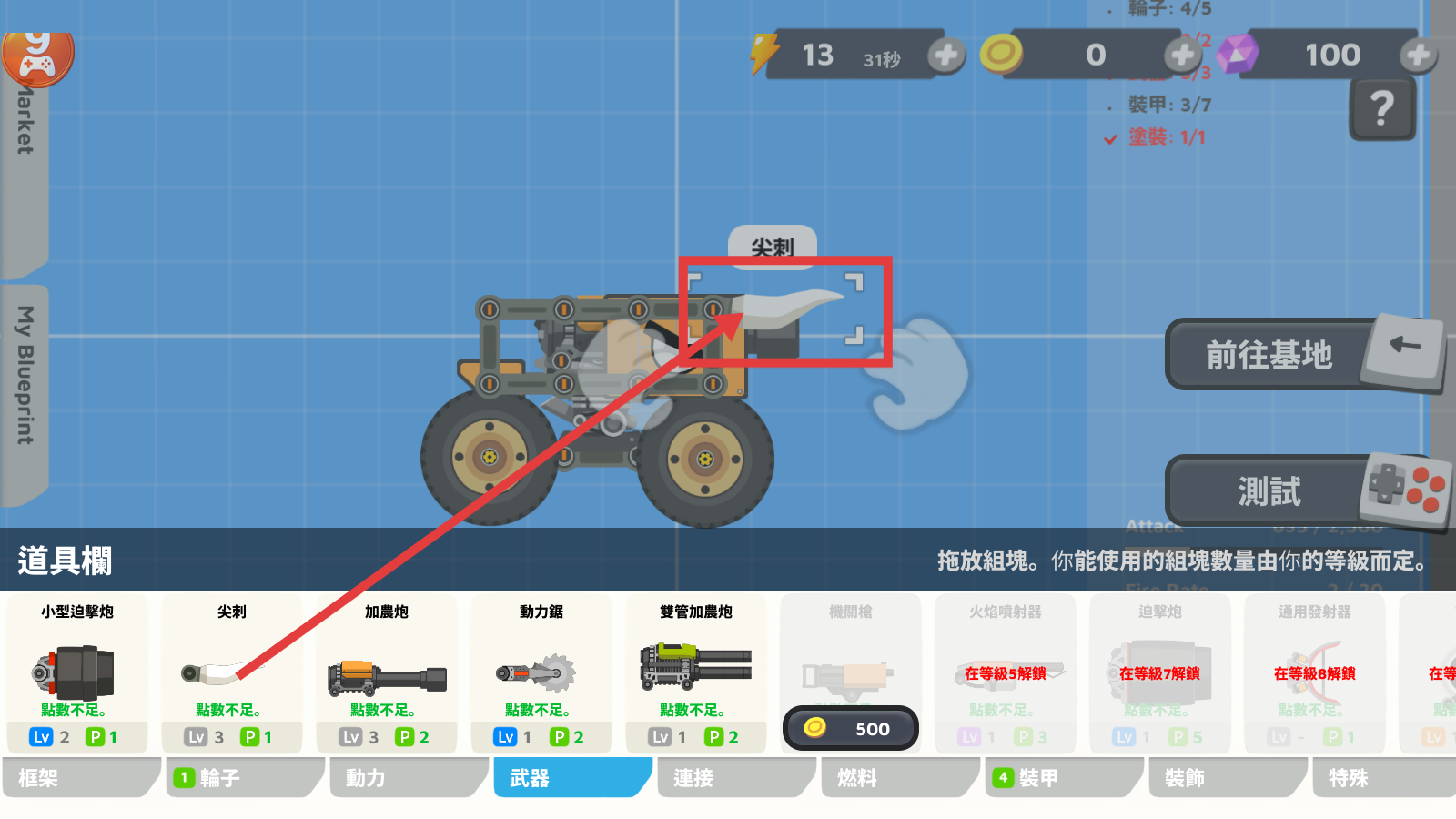 2、在组装界面拖放【尖刺】到坦克,搭配武器部件,增强坦克攻击能力。