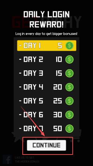 1、首先,在DAILY LOGIN REWARD!界面点击CONTINUE,领取第1天5金币,开启连续登录奖励。