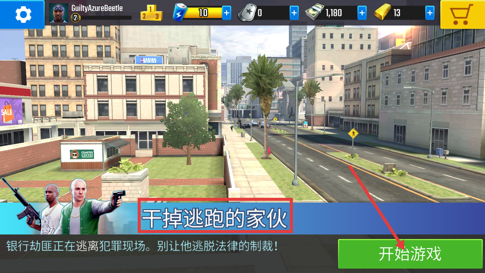 1、接到【干掉逃跑的家伙】任务,点击【开始游戏】,进入狙击场景追捕银行劫匪。