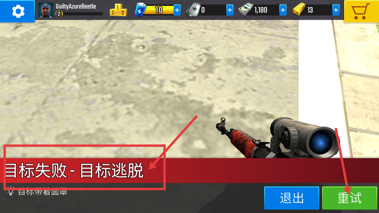 4、若出现【目标失败-目标逃脱】,点击【重试】按钮重新挑战,确保成功追捕劫匪。