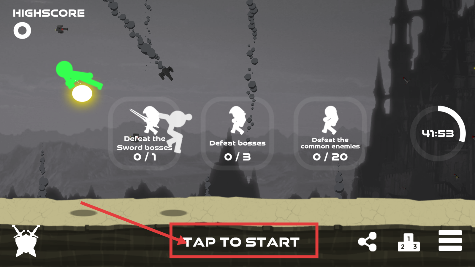 1、点击【TAP-TO-START】,开启游戏,挑战击败剑boss、普通敌人等任务,积累高分。