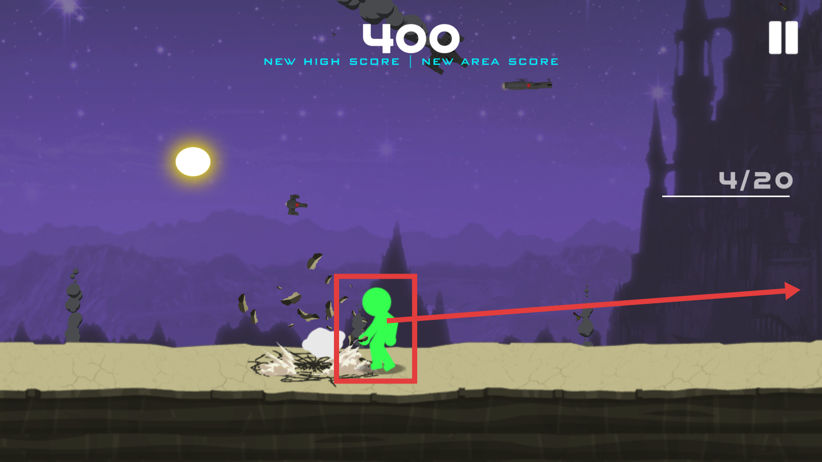 2、操控绿色角色向右移动,击败普通敌人,得分【400】,提升区域得分进度。
