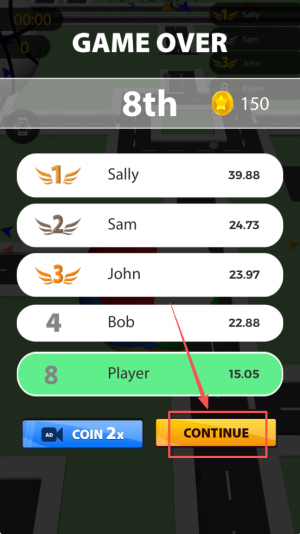 4、最后,当00:00出现“GAME OVER”,点击“COIN 2X”看广告可翻倍15.05分,或直接“CONTINUE”马上重开下一局。