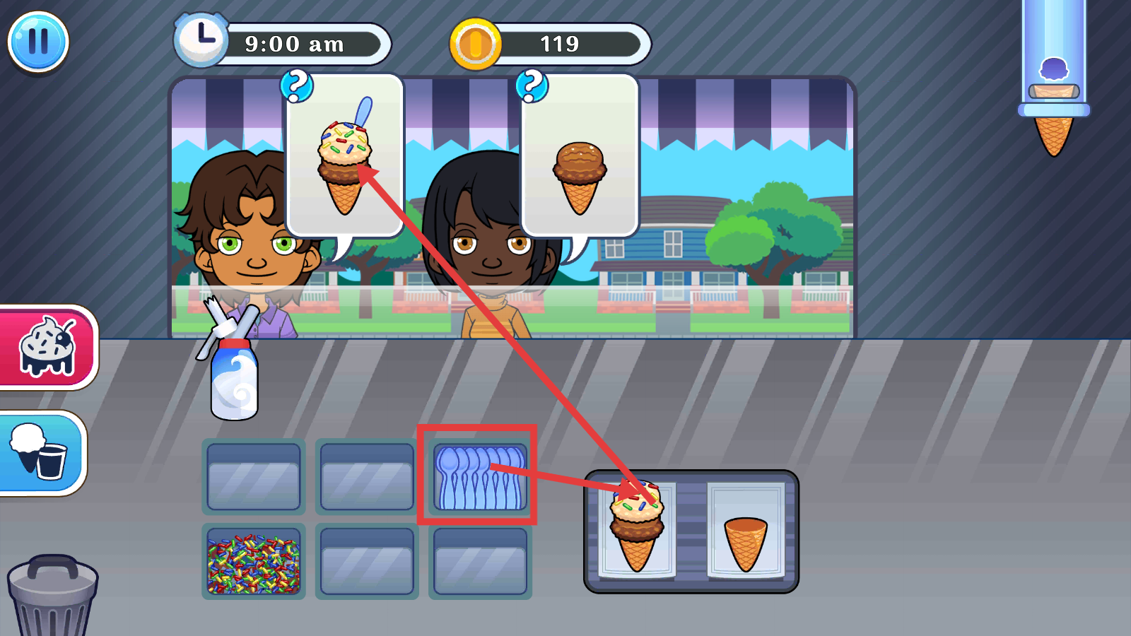 3、面对多位顾客的不同冰淇淋需求,除了基础蛋筒,还要添加对应的配料,如彩色糖屑等,精准满足需求以提升收益。