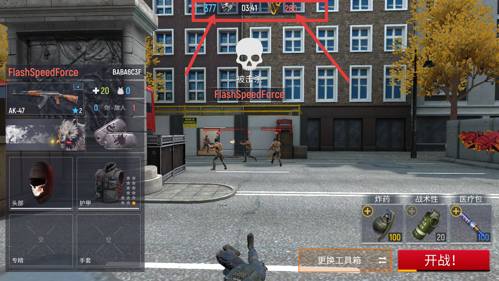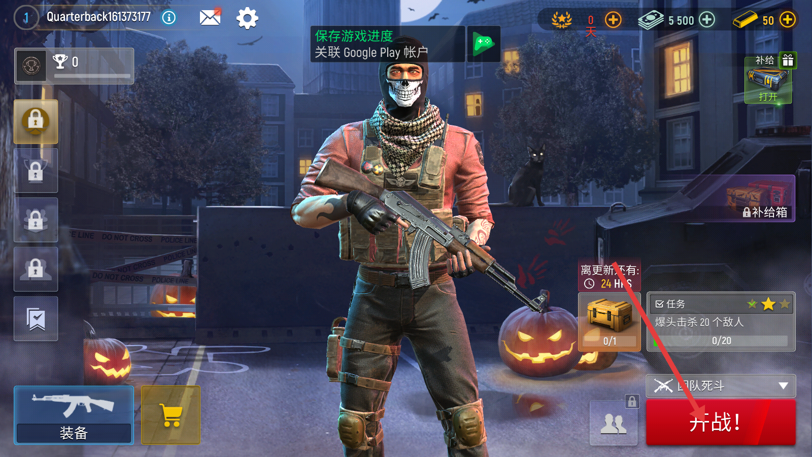 1、进入游戏先查看【任务-爆头击杀20个敌人】,熟悉【装备】界面后,点击【开战!】进入战斗。