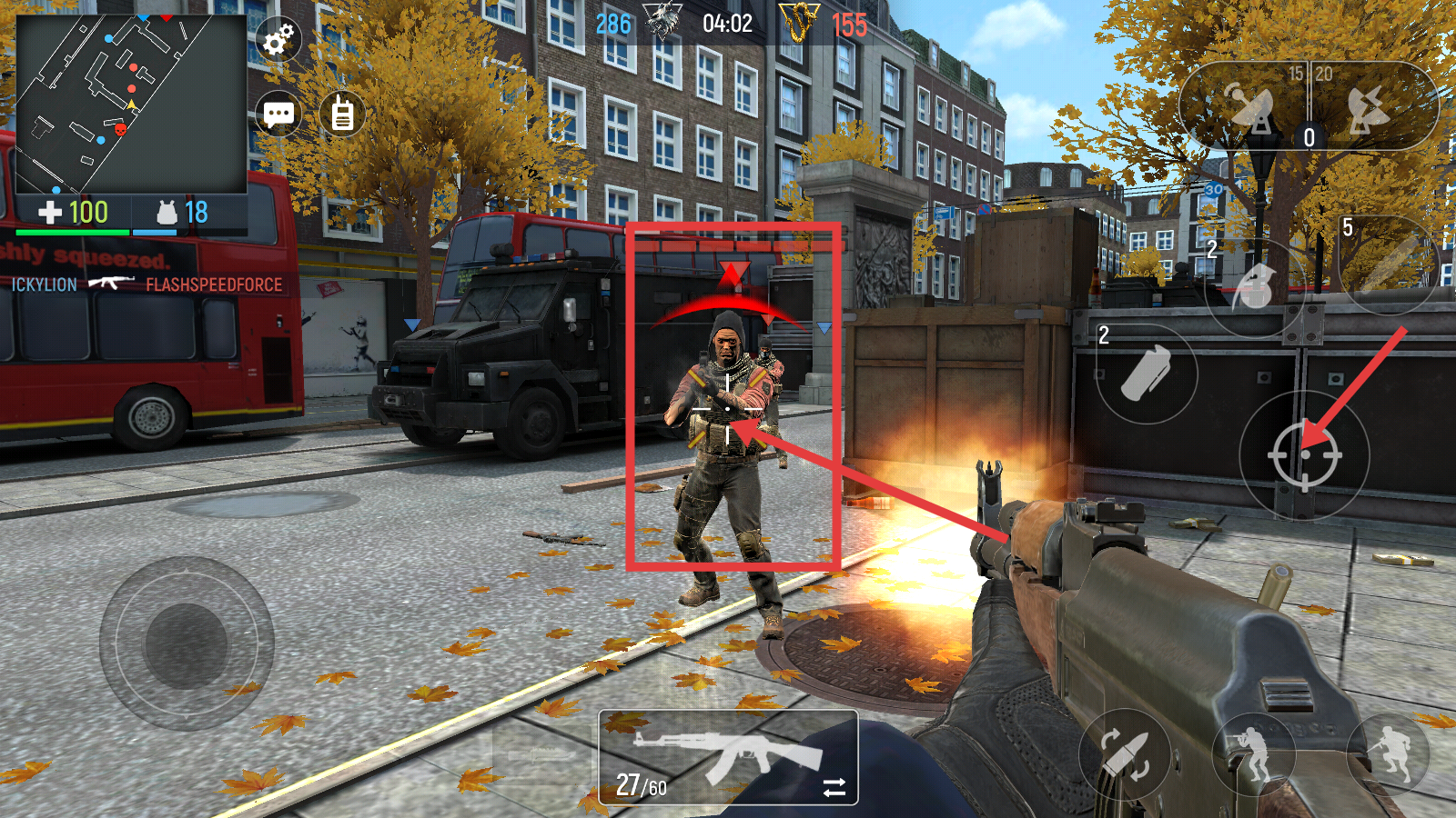 3、遇敌时瞄准敌人身体部位,点击射击按钮开火,利用【AK-47】火力压制,在城市街道中精准打击敌人。