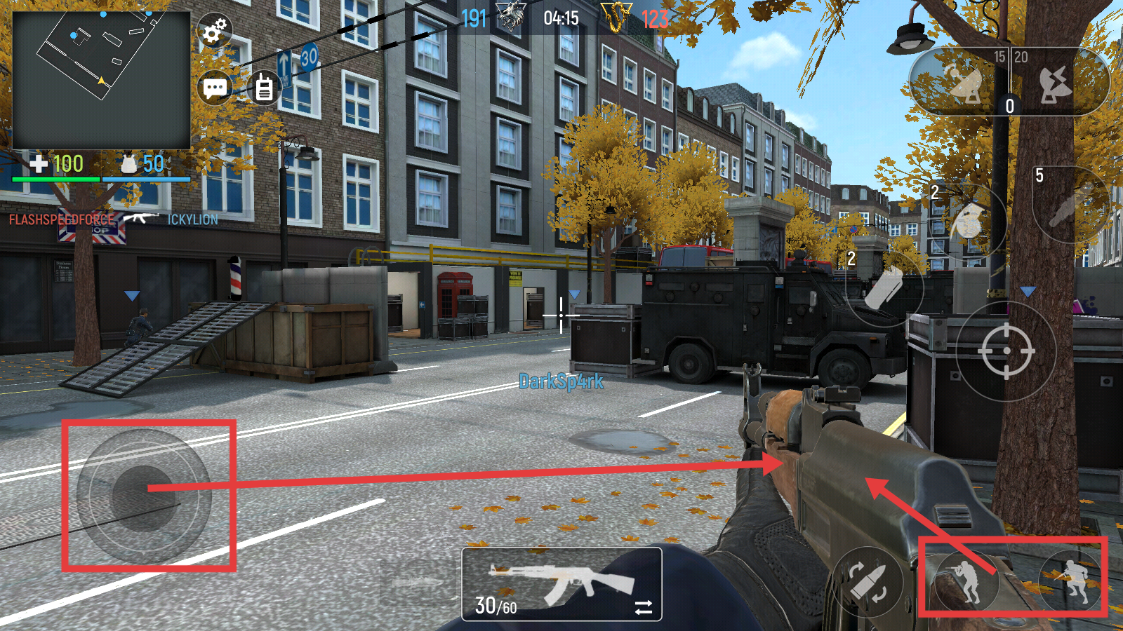 2、战斗中用左侧摇杆移动,右侧按钮控制射击与移动,利用【AK-47-30/60】弹药,在城市场景中灵活走位作战。