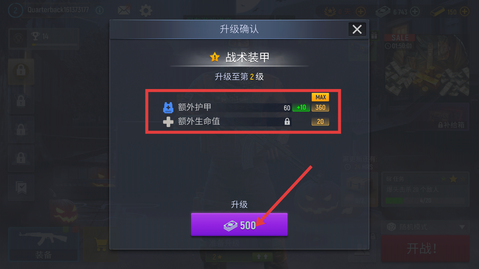 1、升级【战术装甲】至第2级,花费【500】金币,提升【额外护甲-60+10-360】,增强战斗生存能力。