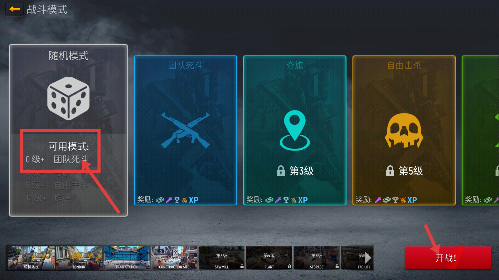 2、选择【团队死斗】模式,满足【0级+】解锁条件,点击【开战!】进入战斗。