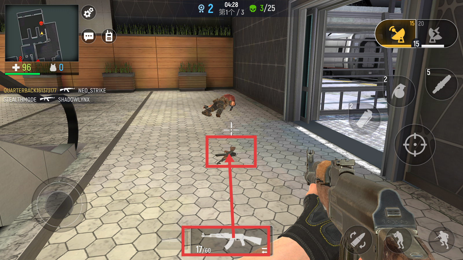 4、击杀敌人后,拾取掉落武器,关注【AK-47-17/60】弹药和血量,持续战斗提升战绩。