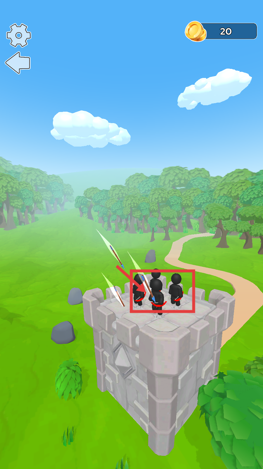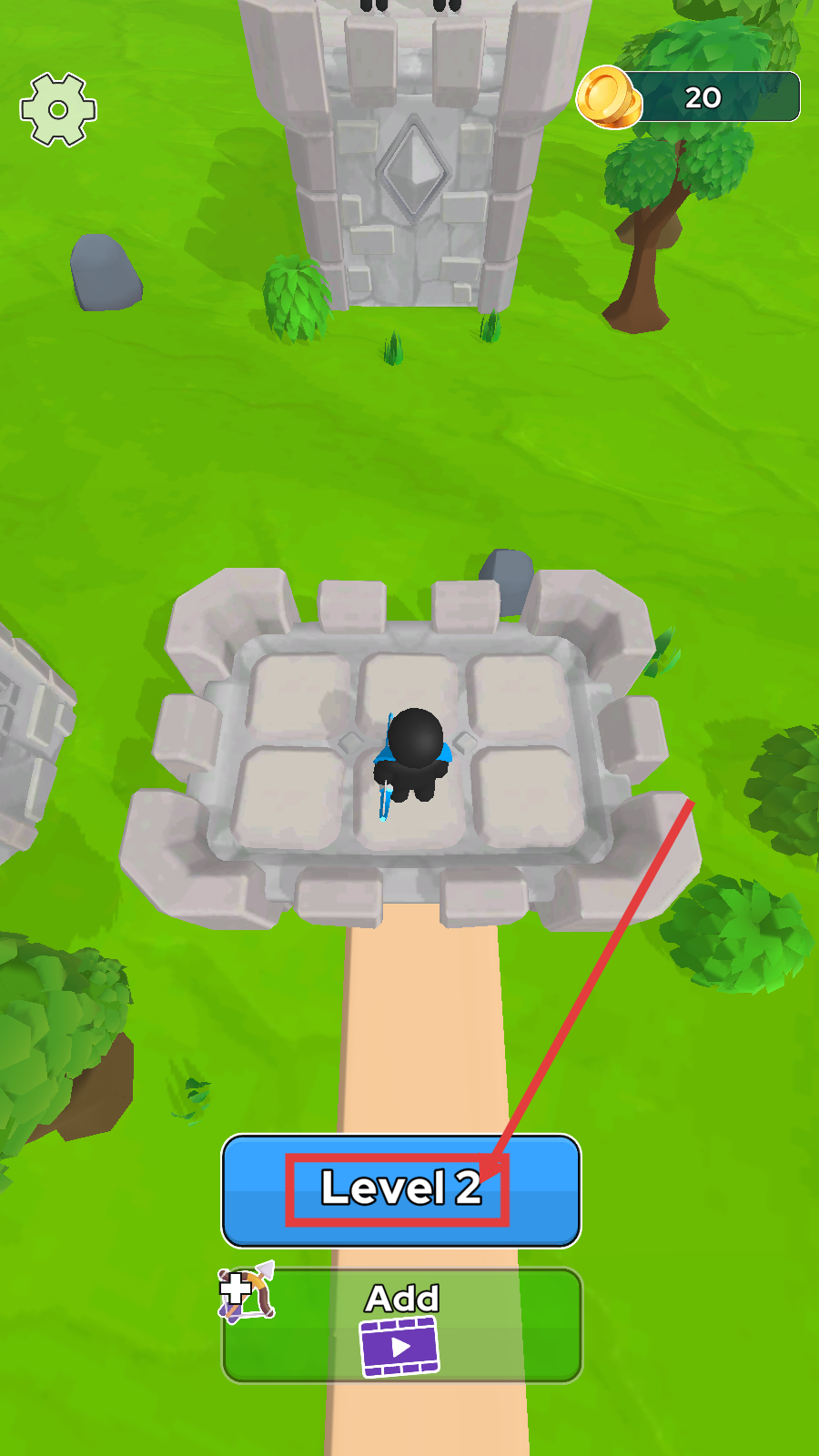 1、升级至【Level-2】后,熟悉城堡与角色布局,进入战斗准备阶段,为后续射箭攻击做好铺垫。