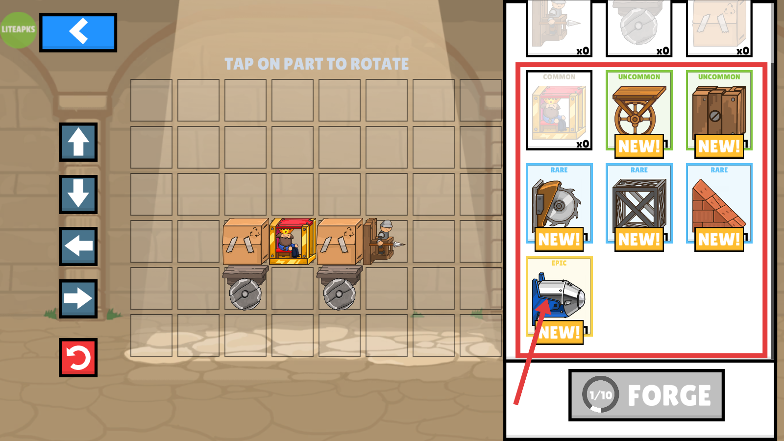 1、在战车编辑界面,将右侧【COMMON】【UNCOMMON】【RARE】【EPIC】级新部件拖拽到网格,完成战车装备升级,强化战力。
