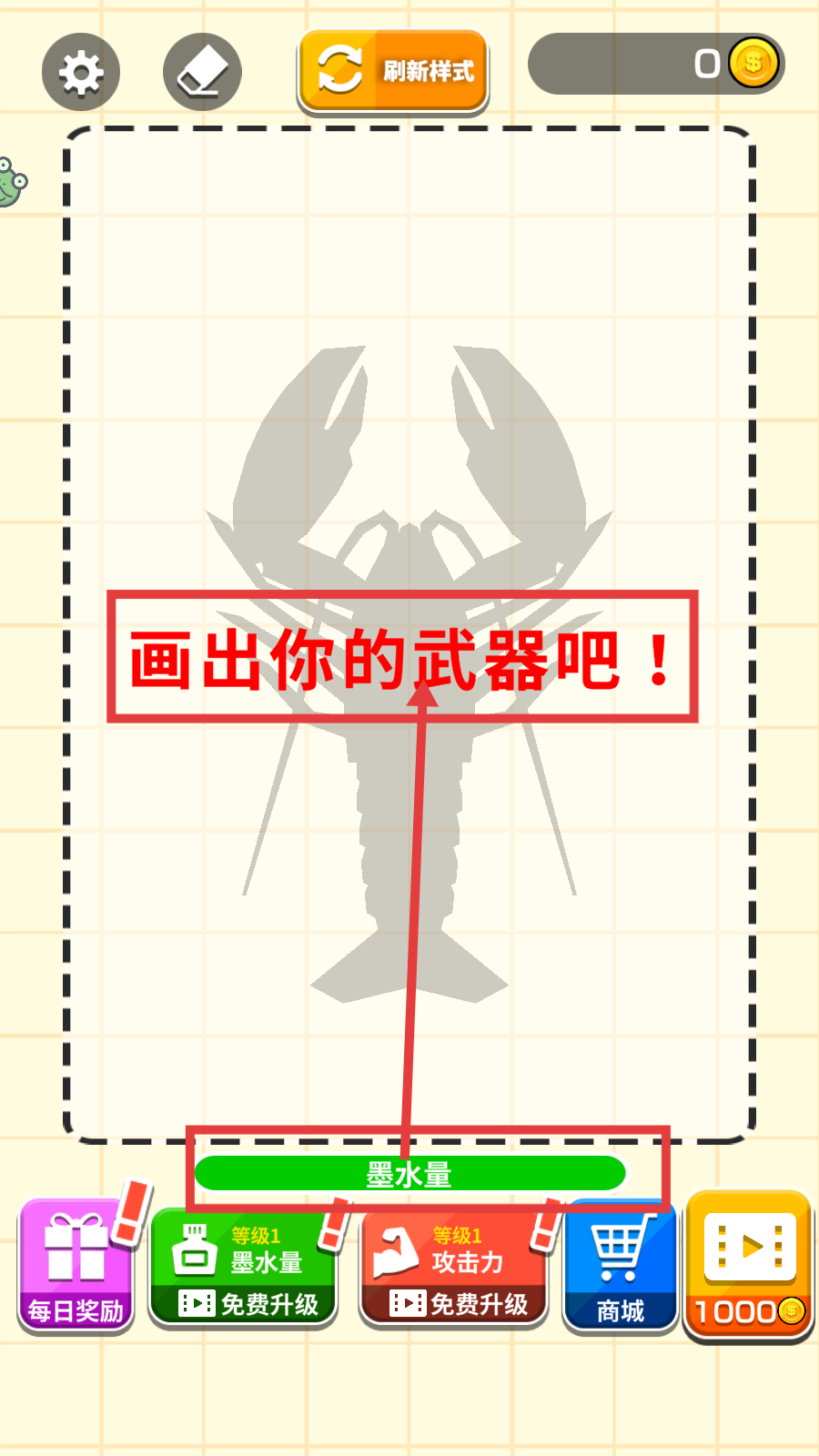 2、在【画出你的武器吧!】界面,利用【墨水量】资源绘制专属武器,为战斗做好准备。