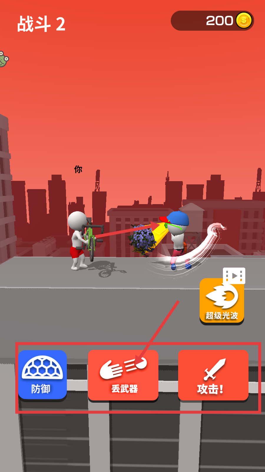 3、在【战斗2】中,灵活运用【防御】【丢武器】【攻击!】按钮,根据战局选择合适操作,击败敌方角色。