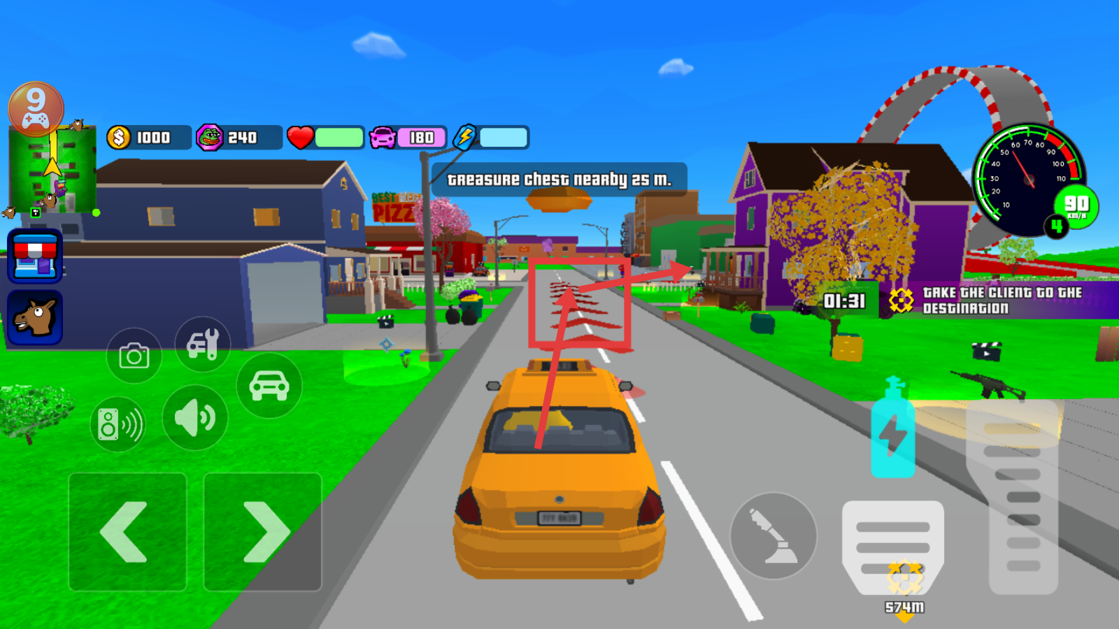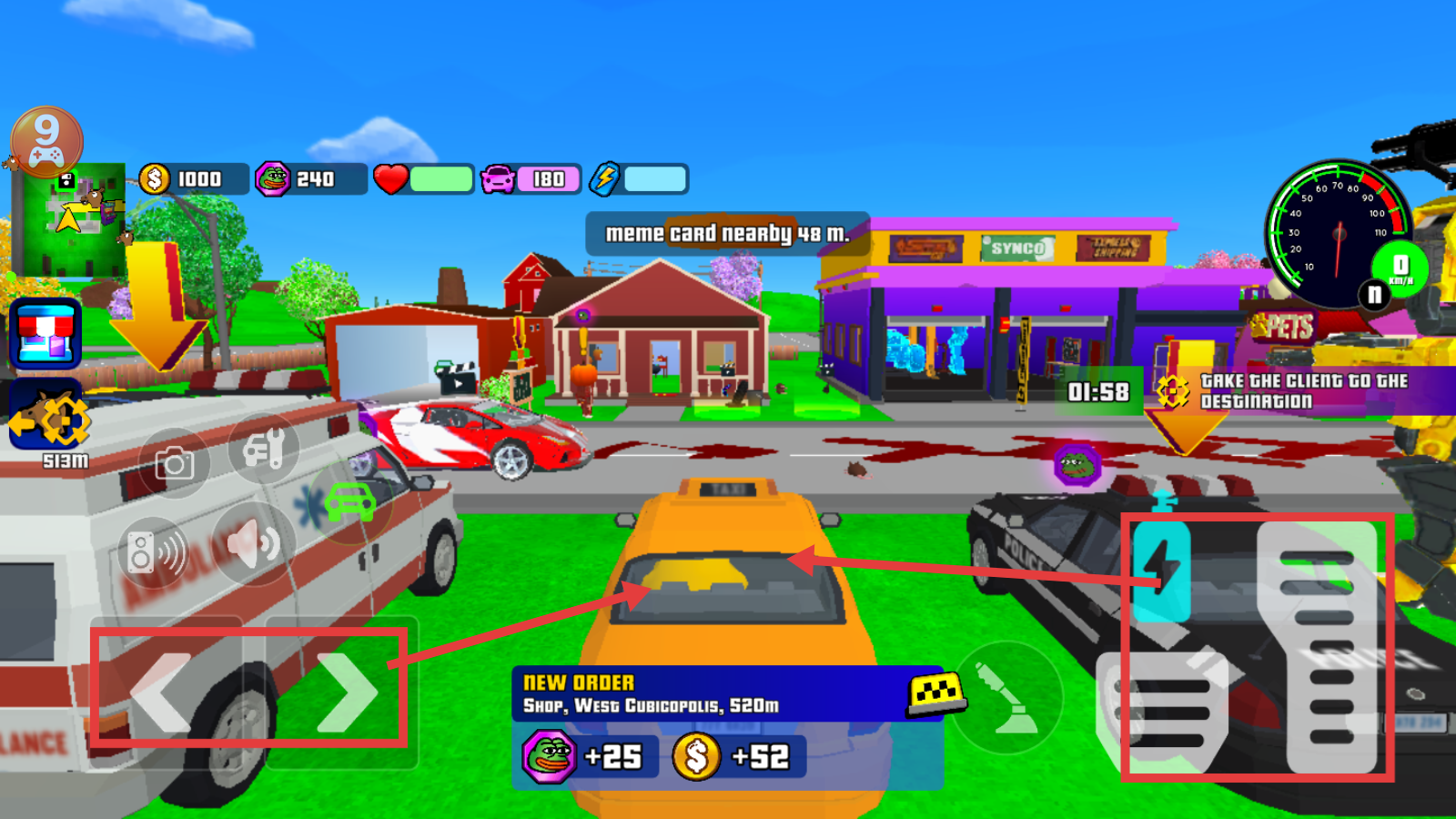 1、驾驶时用左右方向键操控车辆,点击加速按钮提升速度,完成【TAKETHECLIENTGOTHEDESTINATION】任务,留意界面资源数值。