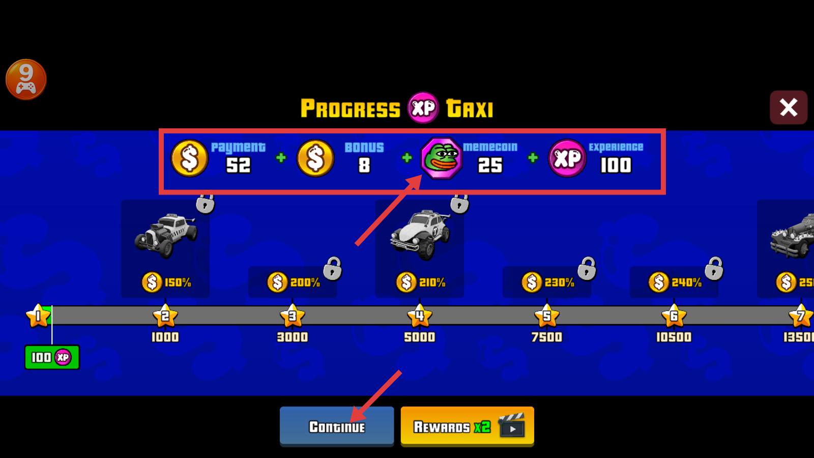 4、完成任务后可获得【Payment-52】【Bonus-8】【memecoin-25】【XP-100】奖励,点击【Continue】继续游戏,积累资源解锁更多车辆。