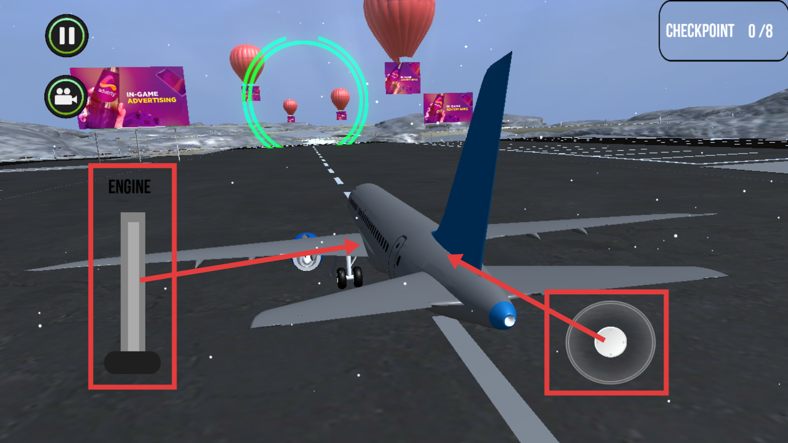 2、驾驶飞机时关注【ENGINE】状态,通过操控按钮控制飞机移动,开始推进关卡。
