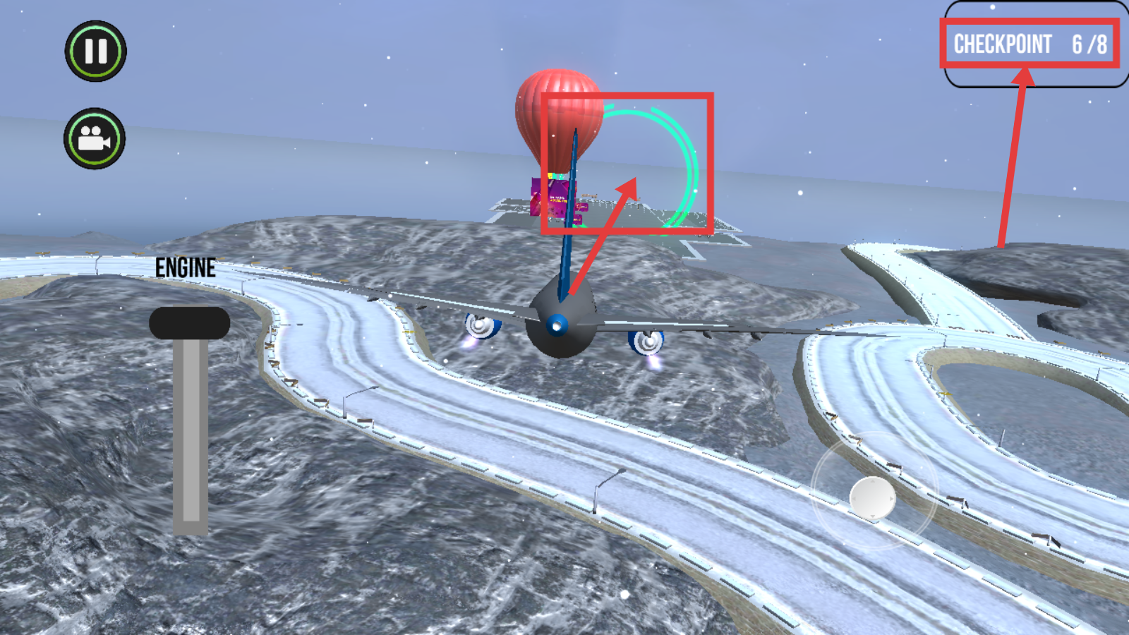 3、飞行中穿过绿色圆环检查点,留意【CHECKPOINT-6/8】进度,逐步完成所有检查点。
