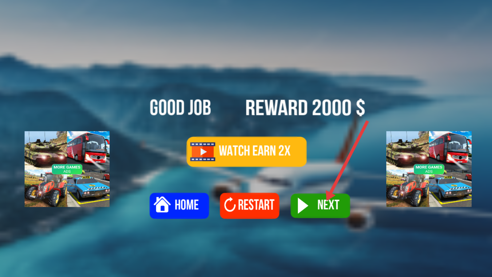 4、完成任务获得【REWARD-2000$】,点击【NEXT】进入下一关,也可选择观看广告获得双倍奖励。