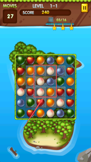 3、然后,在剩余27步内通过交换相邻水果凑成3个或更多同色连线,累计至少240分并收集16个目标水果。