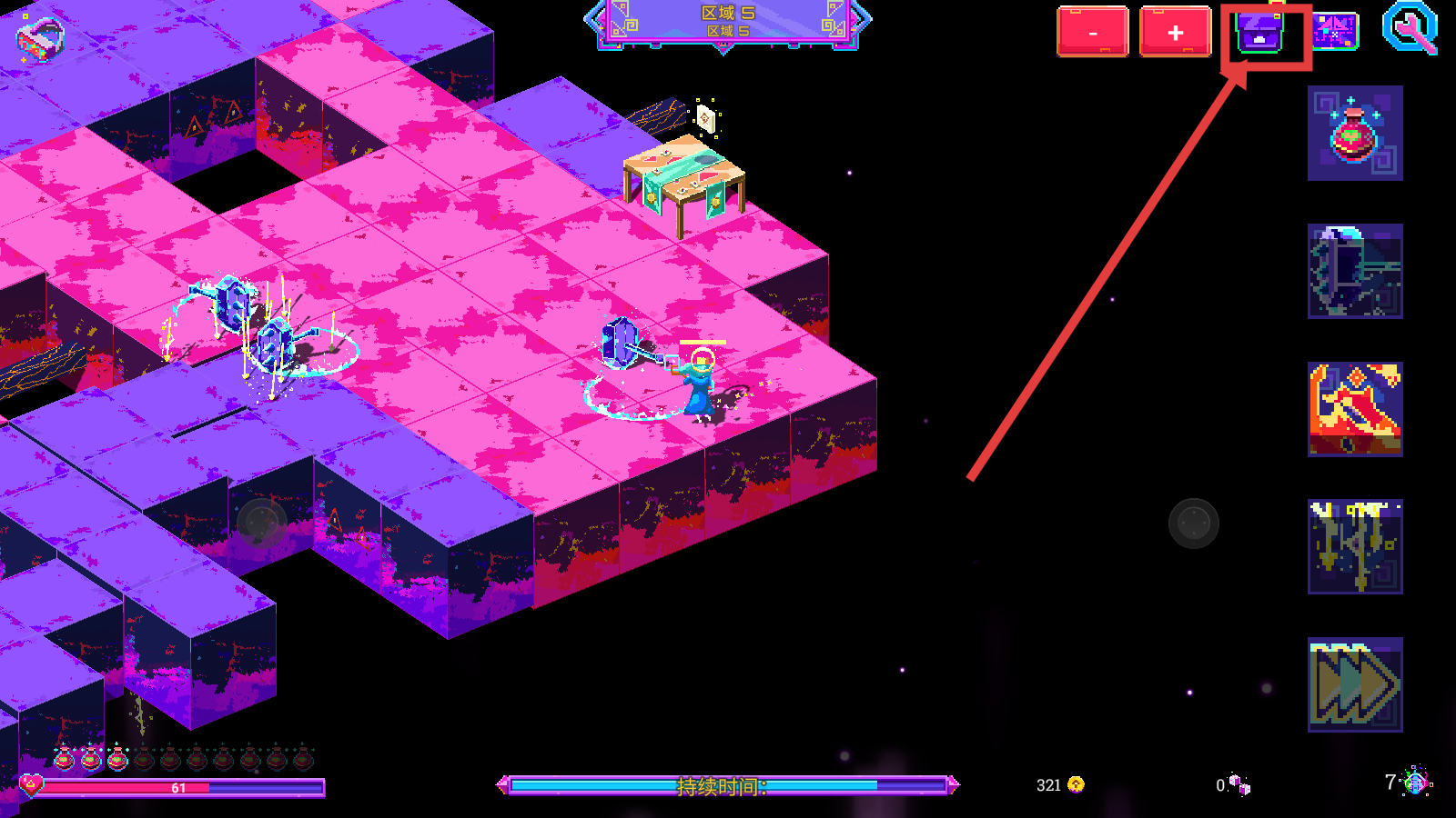 1、在区域探索时点击右上角背包,查看资源,利用角色技能推进【持续时间】进度,积累金币。