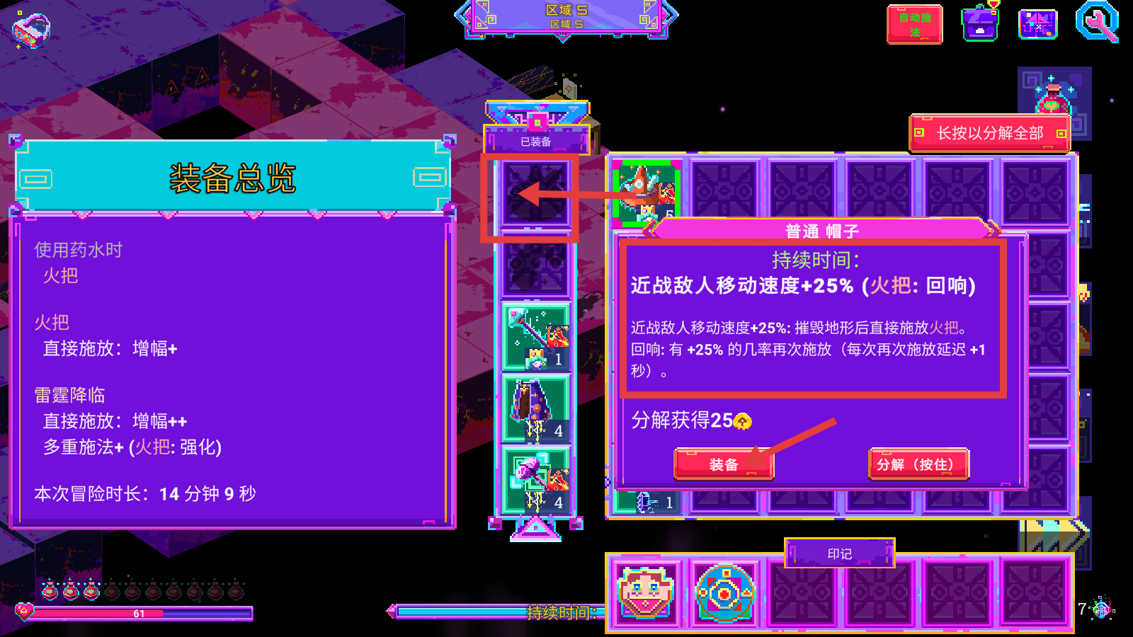 2、进入装备总览界面,查看【普通帽子-近战敌人移动速度+25%】属性,选择【装备】提升战力或分解获取25金币。
