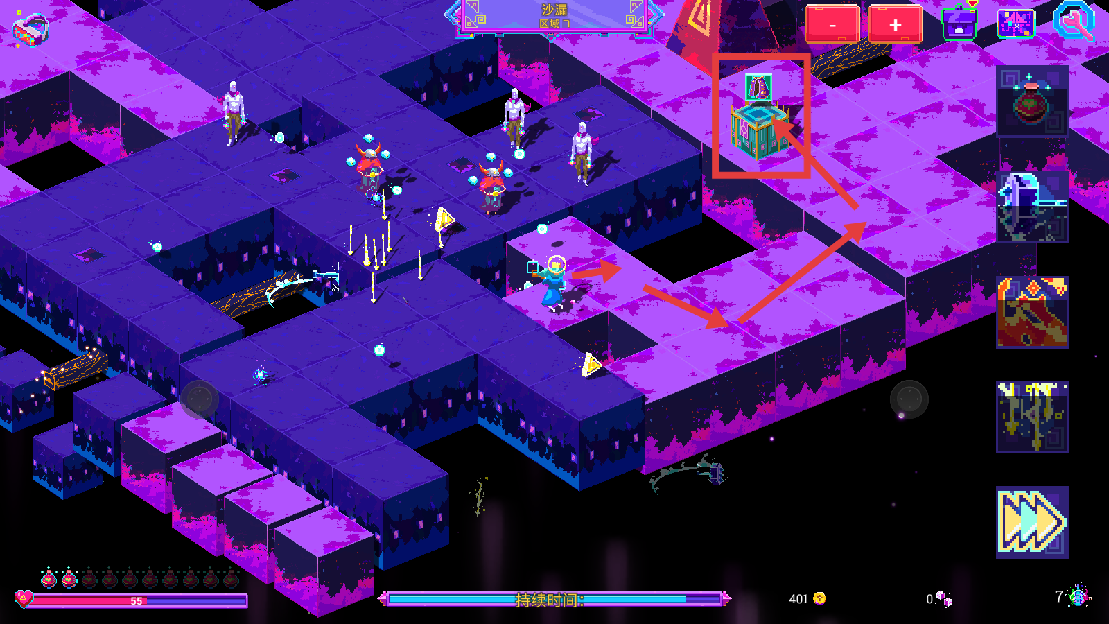4、前往区域7的宝箱位置收集资源,积累金币至401,提升自身战力,继续探索新区域。