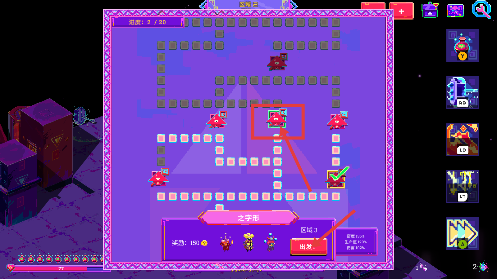 1、关注【进度-2/20】,点击【之字形-区域3】的【出发:】,进入区域探索,应对红色三角敌人。