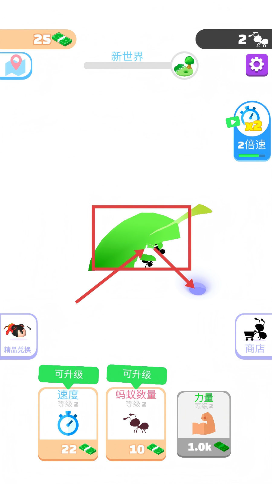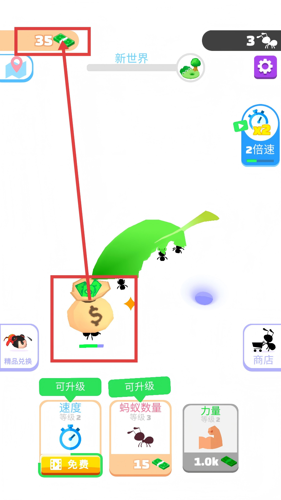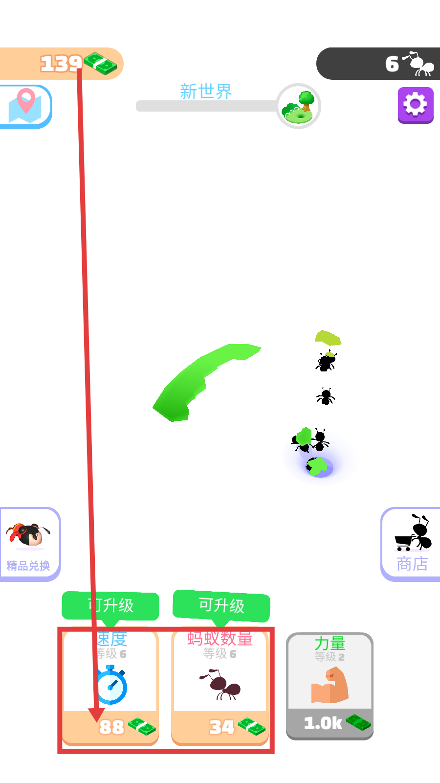 1、蚂蚁搬运资源时,关注【速度】【蚂蚁数量】【力量】的升级选项,利用它们提升搬运效率,同时可通过【精品兑换】【商店】获取增益。