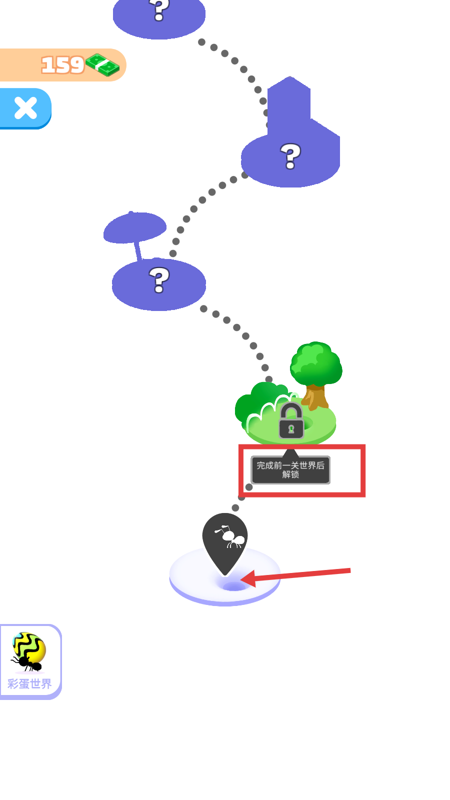 2、通过蚂蚁搬运积累资金,留意金钱袋获取更多资源,积累到足够资金后可用于后续升级。