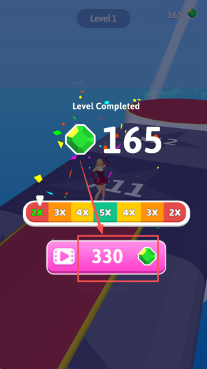 3、抵达终点后倍数条从「2X」跳到「5X」,总分达「165」即显示「Level Completed」。