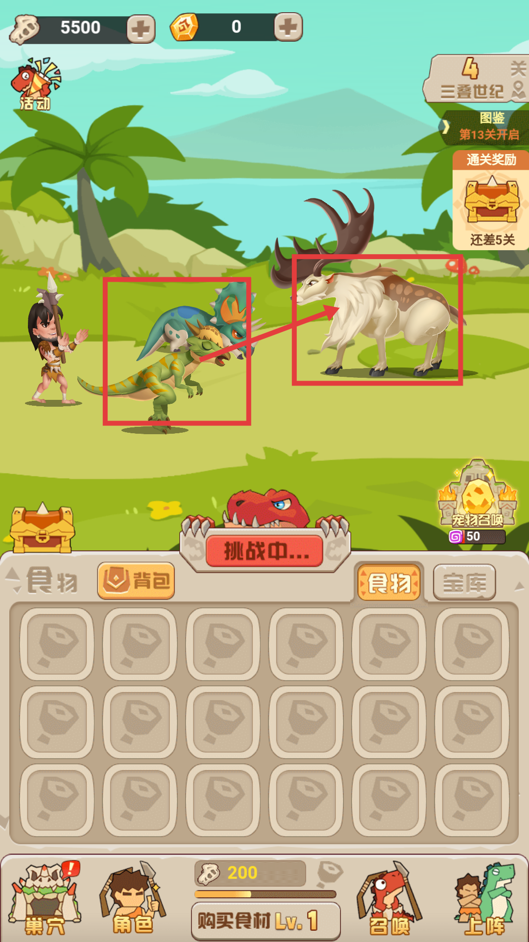2、战斗中操控恐龙与【大角鹿】对战,留意双方战力,合理指挥角色,推进三叠世纪关卡。