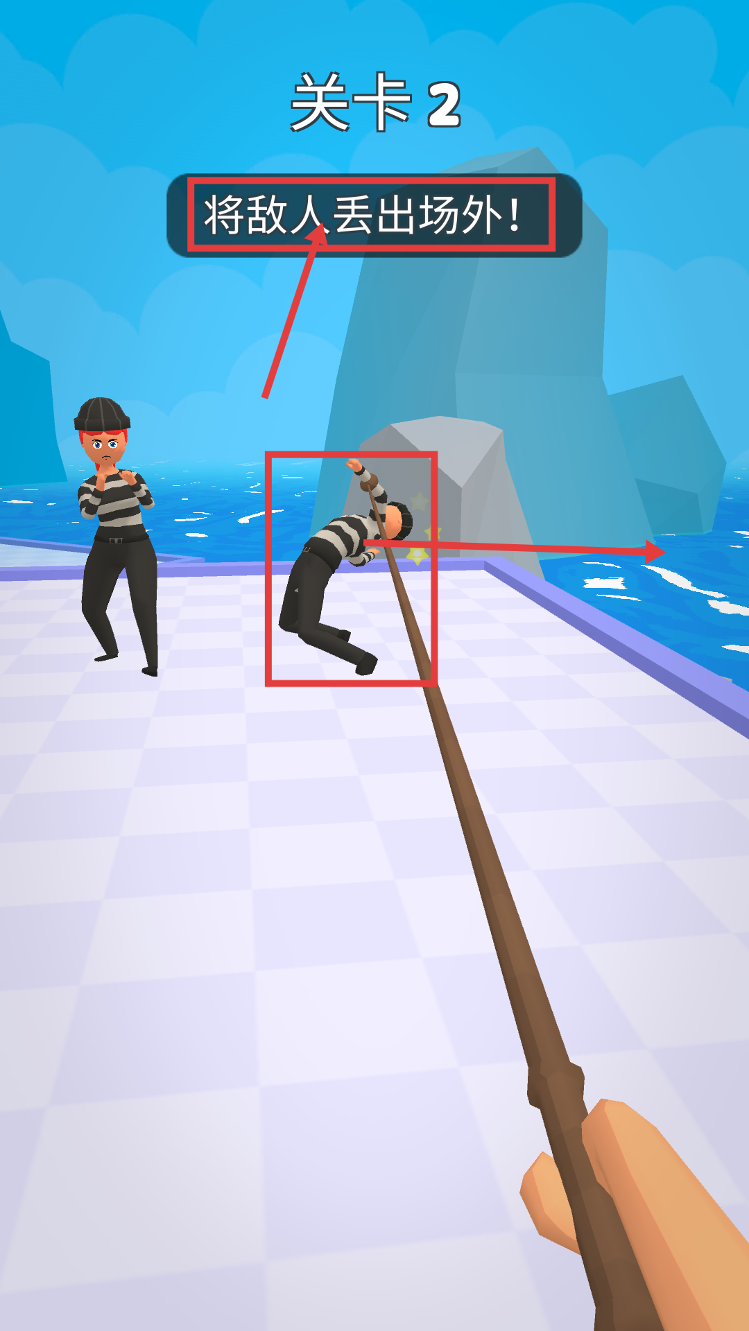 1、关卡2中,遇到穿着囚服的敌人,利用手中绳索类道具瞄准敌人,为将其丢出场外做准备。