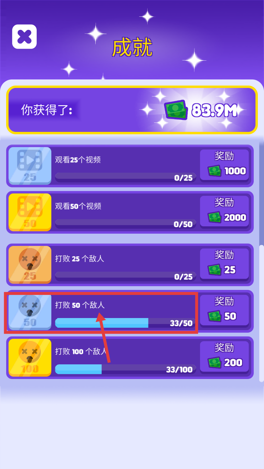1、关注“打败50个敌人”等成就(当前33/50),完成可获取钞票奖励(如打败50个敌人奖50钞票),积累成就进度以提升资源获取。