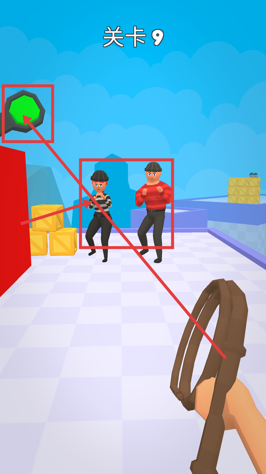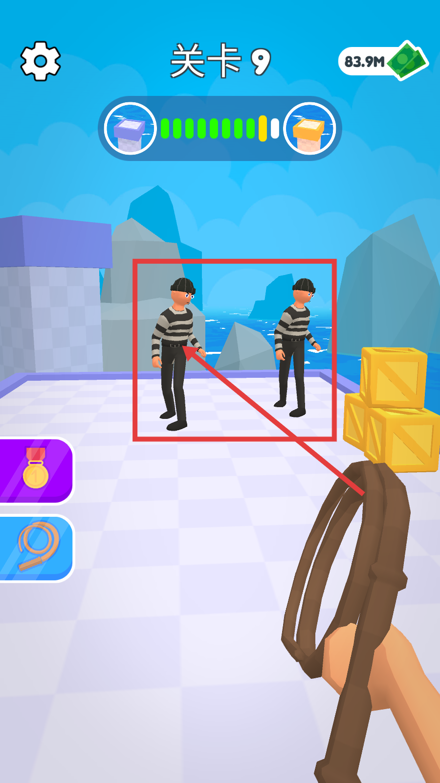 2、遇到囚服类敌人,利用绳索道具瞄准,策略性将其丢出场外;面对不同服装的敌人(如红条纹装敌人),需灵活调整操作节奏。