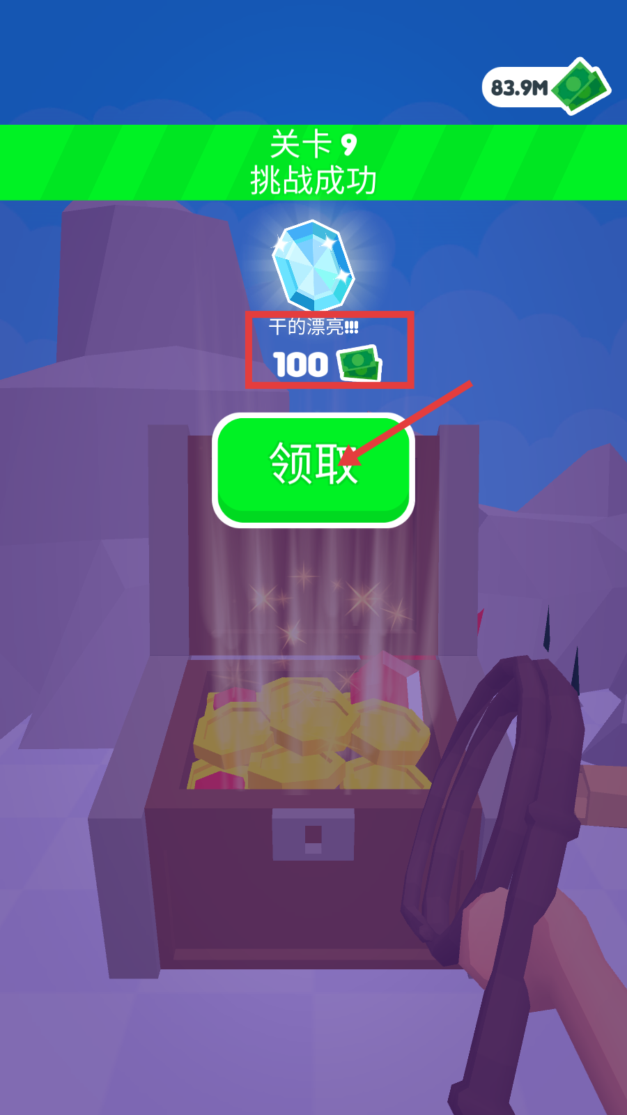 4、关卡9挑战成功后获得100钞票,点击“领取”积累资源,用于升级绳索道具或解锁新关卡内容。