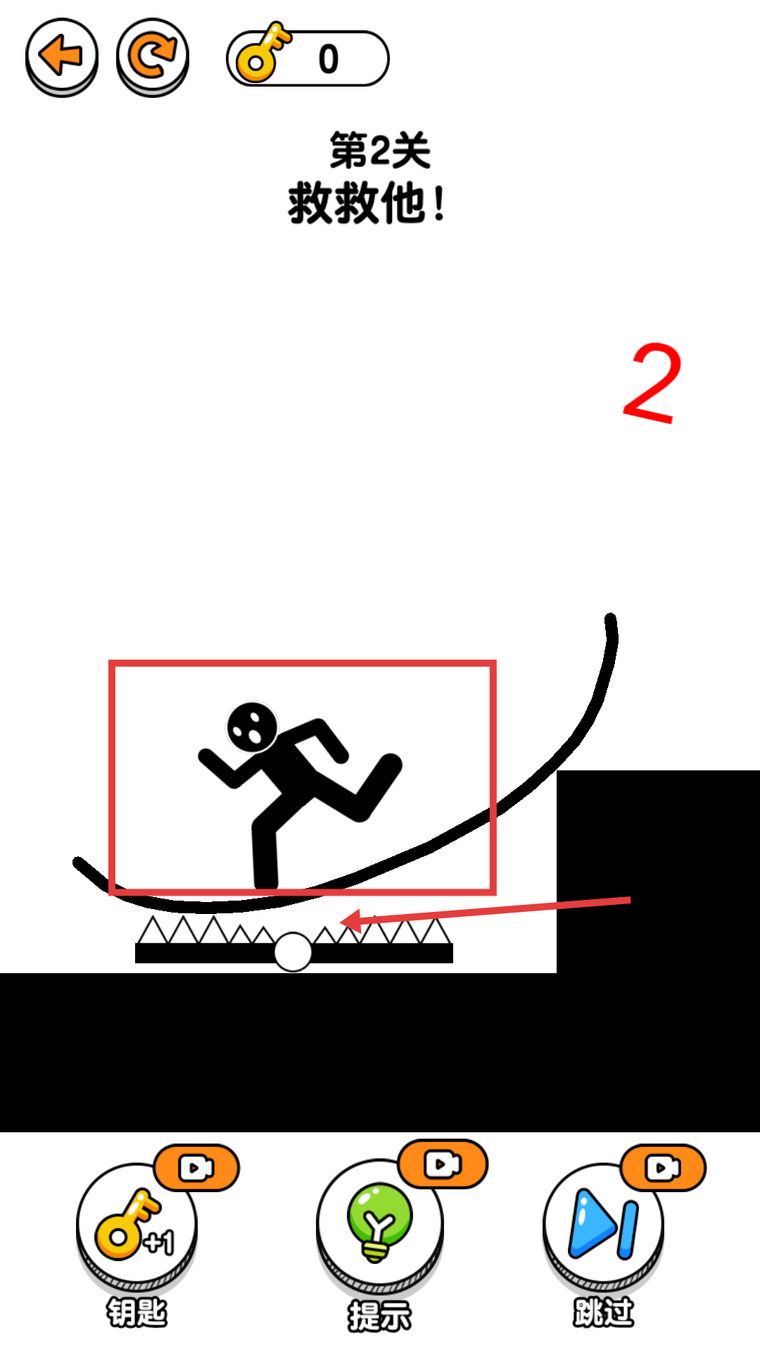 3、在【第2关】中,通过画曲线的方式搭建路径,让火柴人安全越过【尖刺陷阱】,顺利推进关卡。