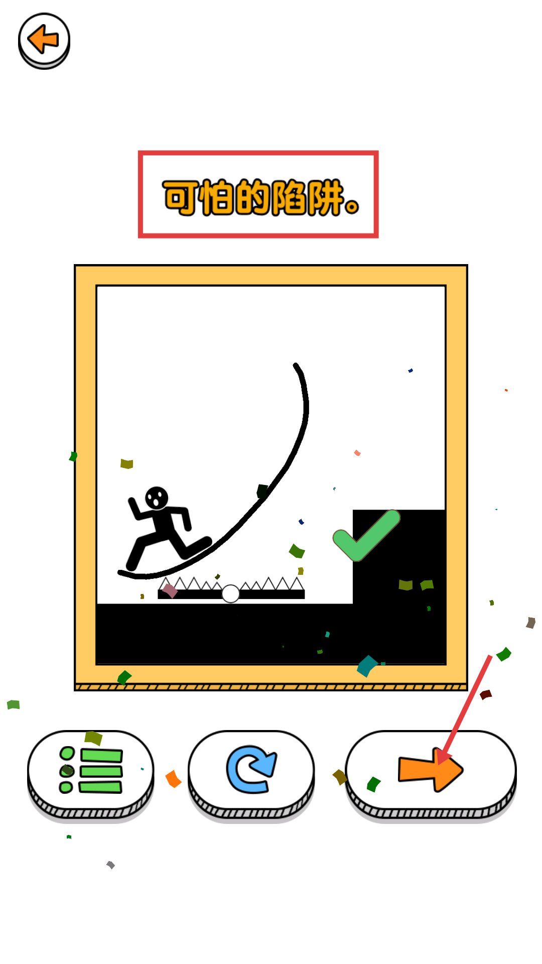 4、成功通过【可怕的陷阱】关卡后,点击橙色箭头按钮继续挑战,逐步解锁更多有趣关卡。