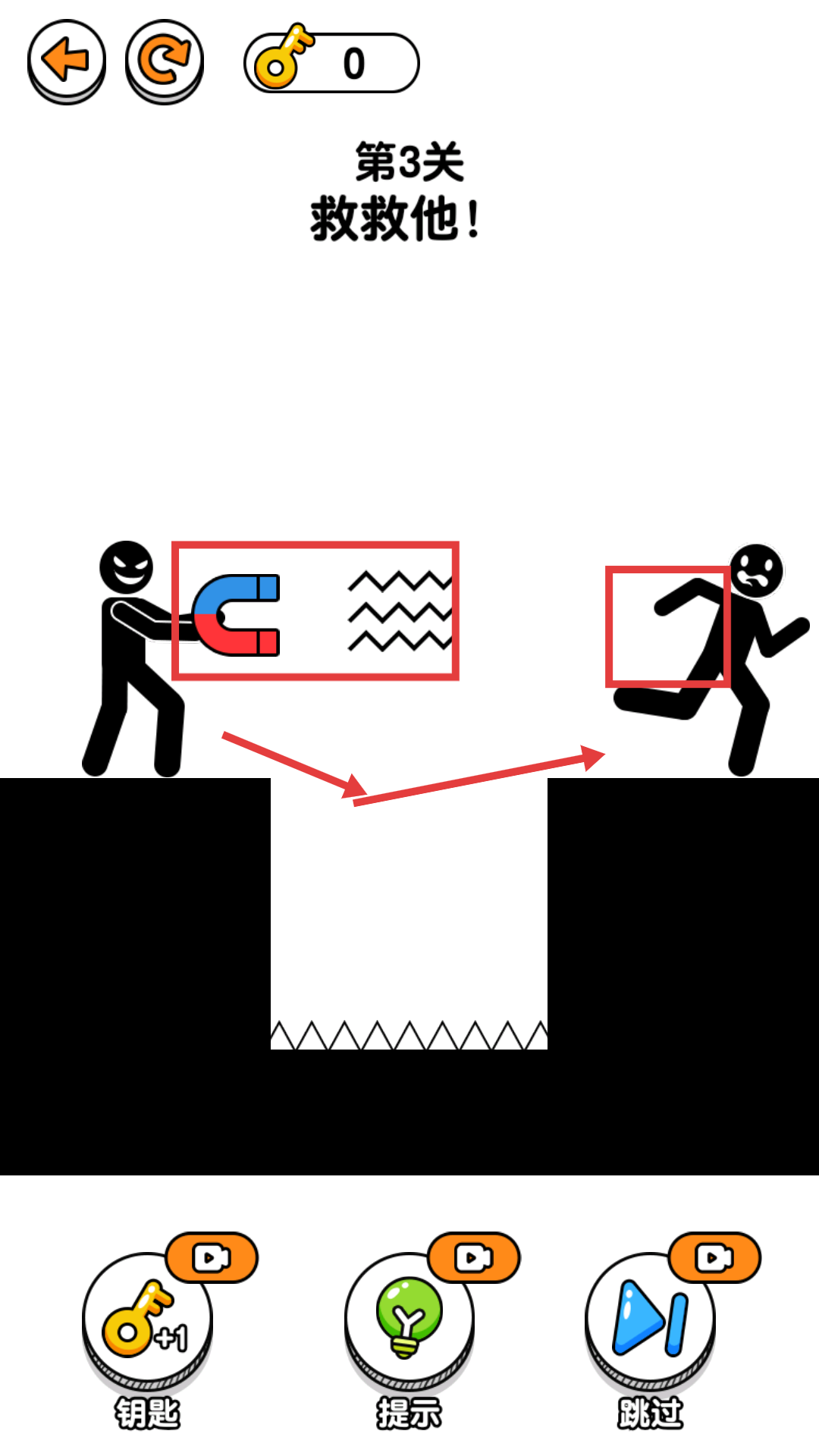 2、挑战【第3关-救救他】时,留意左侧【磁铁】和下方【尖刺陷阱】,这些是需规避的危险元素。