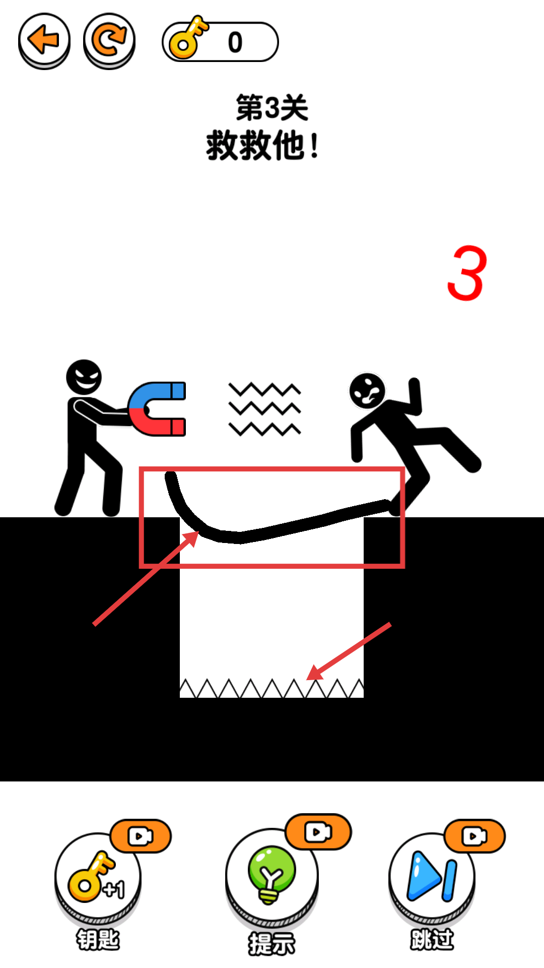 3、在【第3关】中,画曲线路径连接平台,让火柴人安全通过,避开【尖刺陷阱】与磁铁影响。