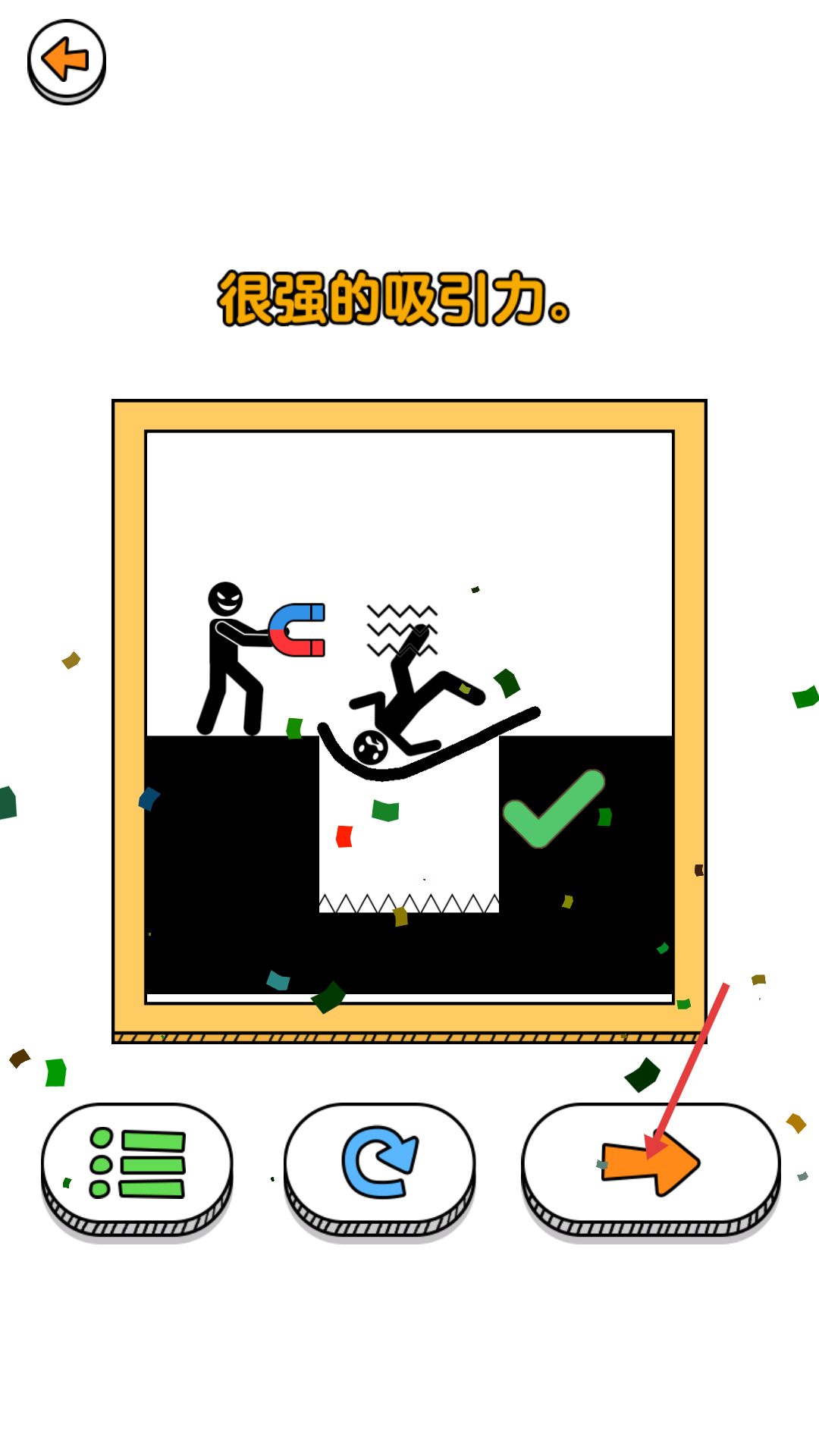 4、通过【很强的吸引力】关卡后,点击橙色箭头按钮继续挑战,解锁后续关卡。