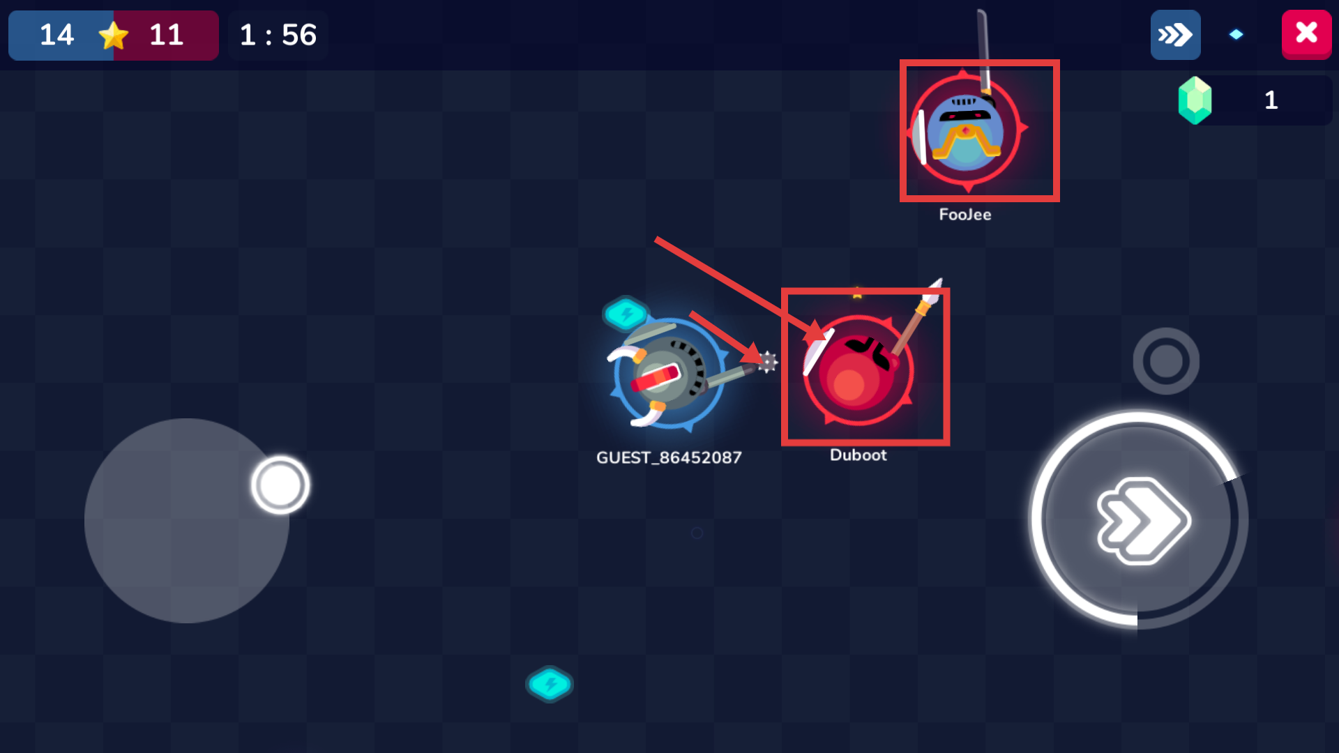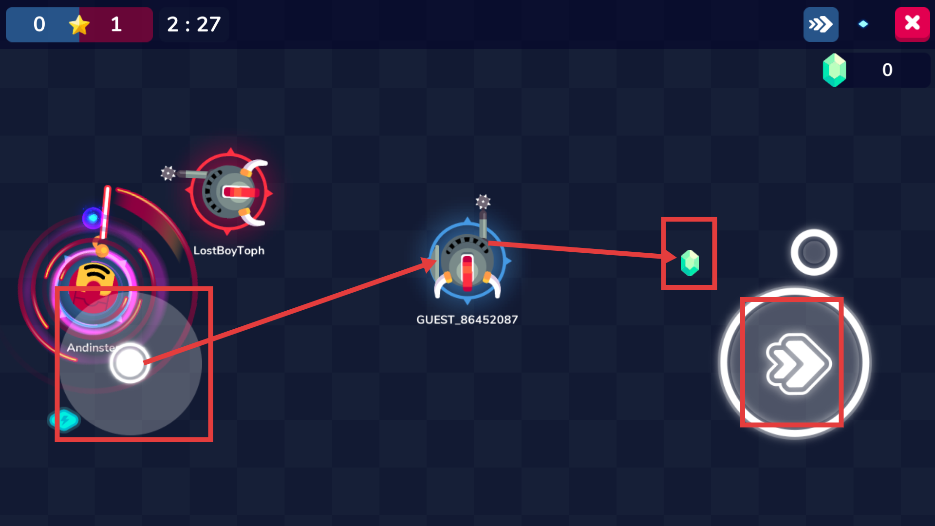 2、游戏内利用左侧控制移动,右侧按钮发起攻击,优先收集【宝石】积累资源。