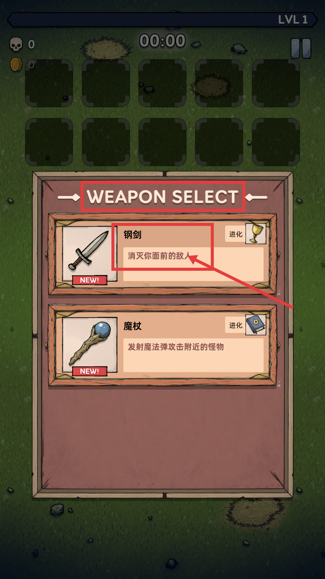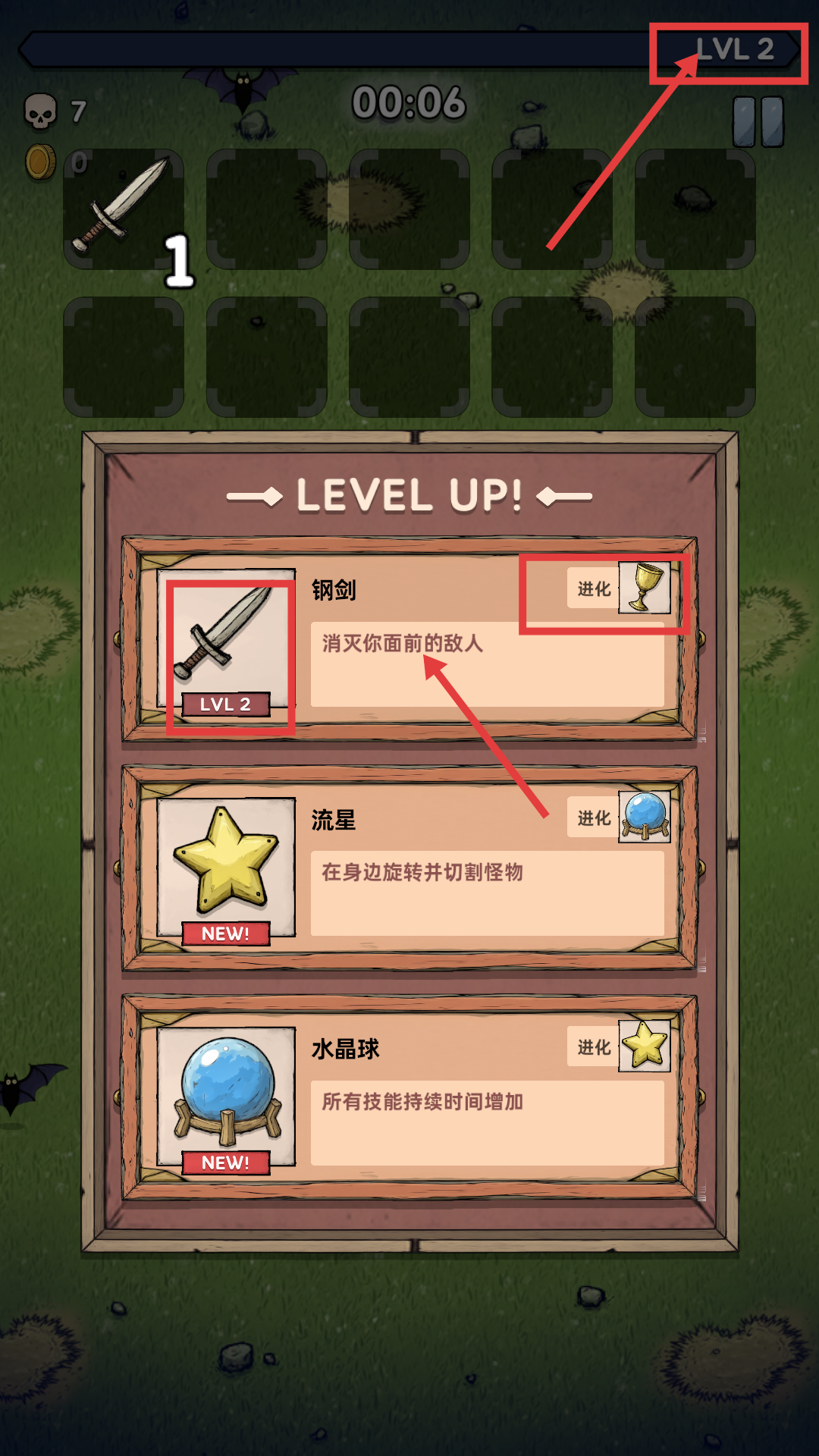 4、升级到【LVL-2】时,优先升级【钢剑-消灭你面前的敌人】,使其进化以提升战斗能力。