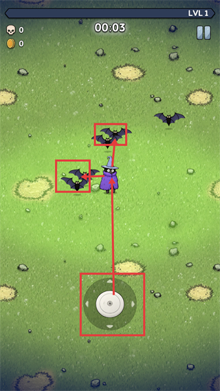 3、通过下方控制盘操控角色移动,躲避蝙蝠类敌人的攻击,保持走位灵活以避免伤害。