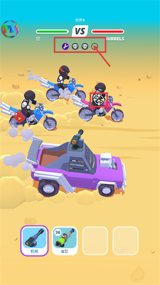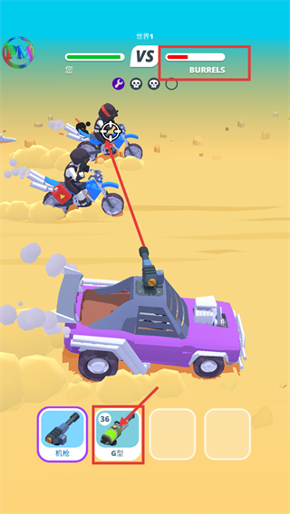 2、战斗中瞄准摩托车枪手,利用武器(如机枪、G型)攻击,持续消耗对手(BURRELS)血量,保持自身血量优势以推进战斗。