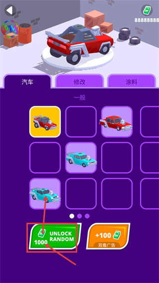 1、在车库界面点击“UNLOCKRANDOM1000”,消耗1000金钱解锁随机车辆,提升战斗属性,为后续关卡提供战力支持。