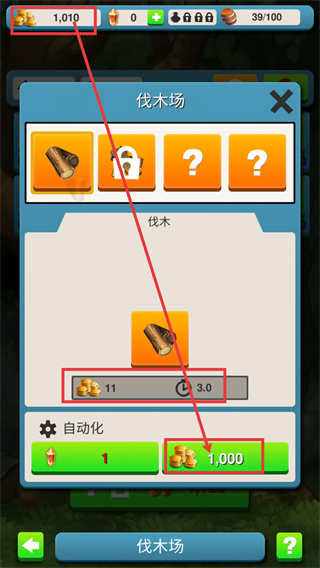 2、在伐木场消耗【1000】金币伐木,每次获【11】金币,耗时【3.0】,积累金币用于发展。